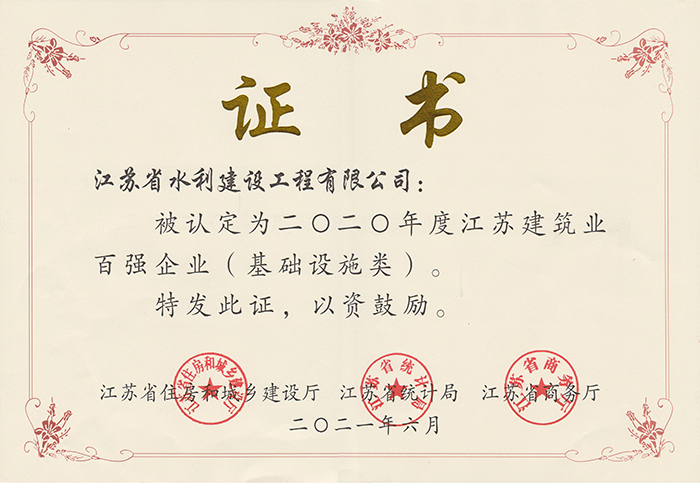 江蘇建筑業(yè)百強企業(yè)2022年度證書